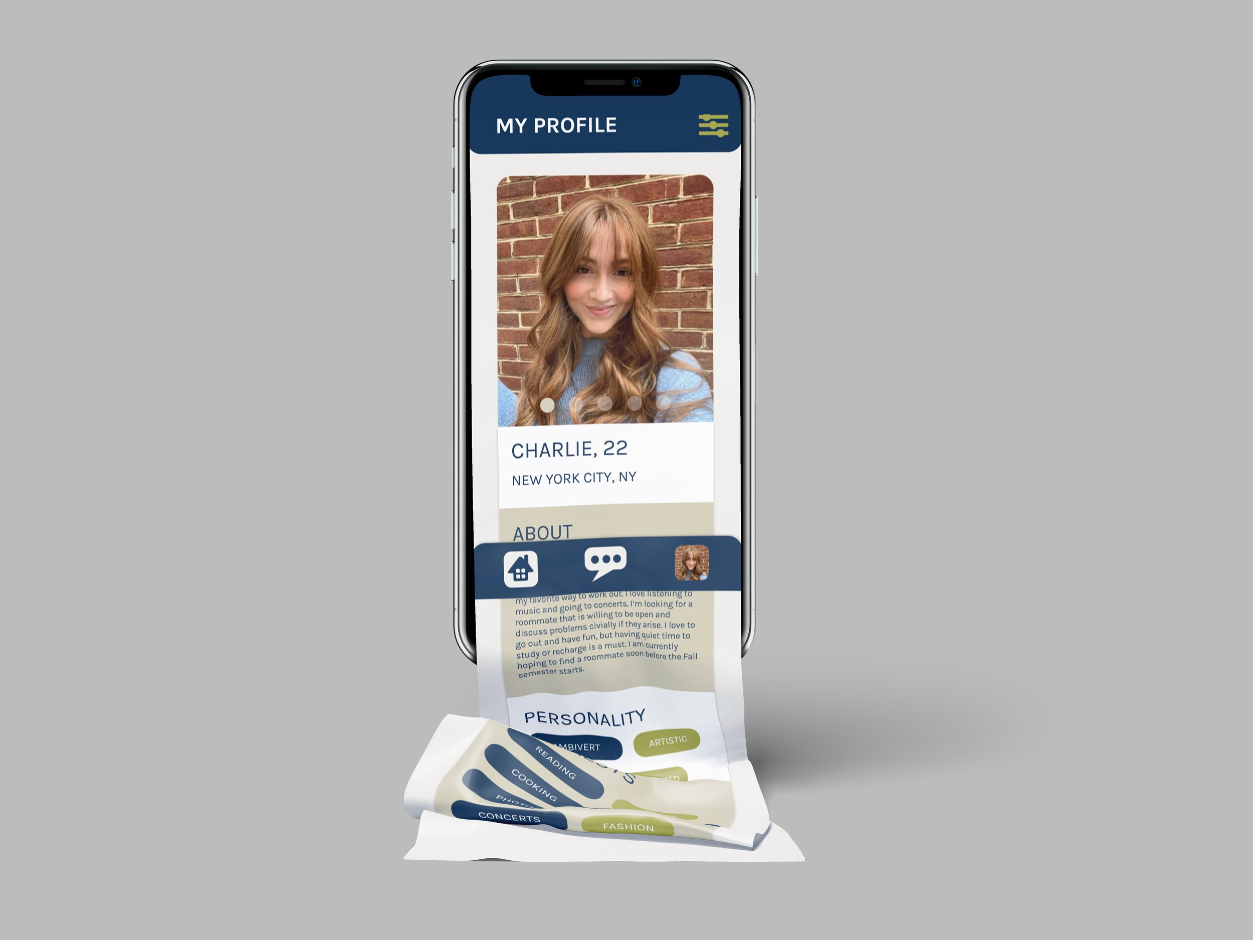 I created a roommate app called Roomie that combines the familiar interface of a dating app with the practicality of finding a roommate. I started by creating a persona that expresses my users wants, needs, and frustrations. They were looking for a roommate that shared similar interests and hobbies. I wanted to create a simple design and layout that makes looking for potential matches easy and efficient. I incorporated user-friendly features such as detailed profiles and customizable preferences to go along with my users concerns. The main home screen is like a dating app where you are able to swipe right to like or swipe left to dislike. The color scheme is aimed to make the process feel as natural and enjoyable as possible. I wanted it to feel calming, not frustrating. For each users profile you are able to write a little about yourself and your interests, so that when people click on your profile they can read all about you.